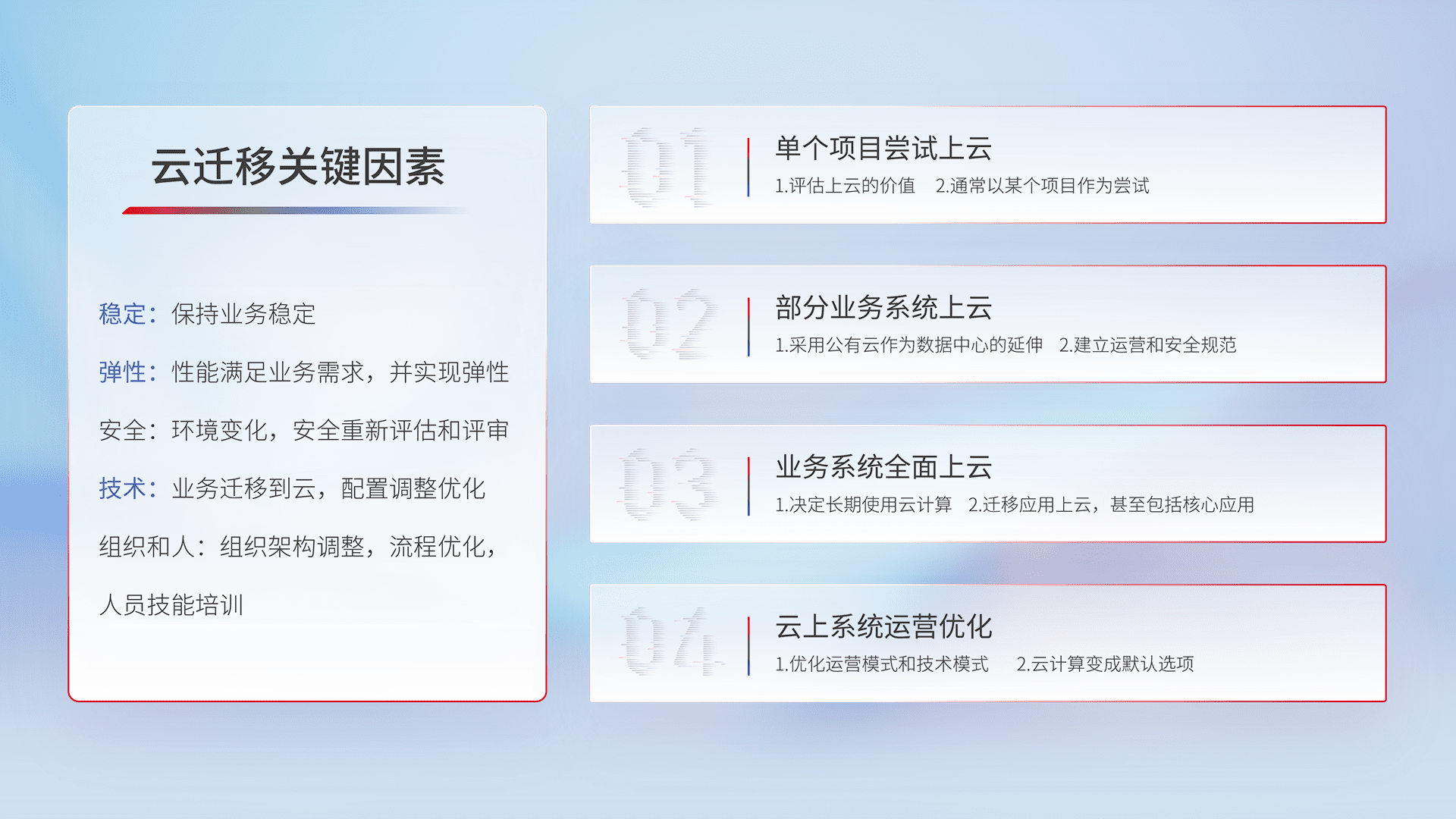 结合实际业务,,从规划设计、、云平台选型、、、、云原生改造、、数据迁移、、、、集成交付,,,迁移全过程为客户识别最佳上云路径,,做好风险识别管理,,,设计网络架构、、身份权限、、、、安全审计合规、、操作审计、、、、日志审计、、监控告警策略、、多站点容灾设计等,,,,对云上基础设施进行整体规划,,,提升IT治理水平,,,,以满足弹性、、高可用、、、、高性能的需求。。。。