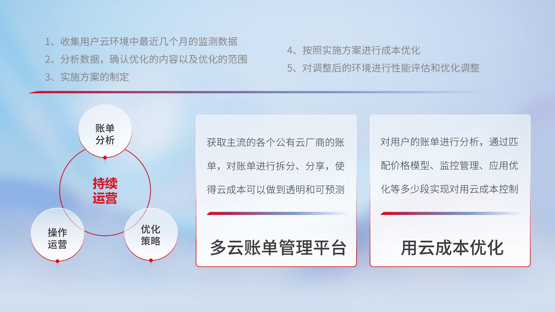 通过多云纳管,,以统一的资源数据模型把客户的云资源进行抽象和封装,,,,进而实现对多云资源的统一操作,,保障云资源管理的可靠性、、、稳定性与可用性。。。量身定制化运维内容,,,,配置、、开发运维、、、补丁管理、、、、备份、、、监控、、认证和访问管理、、、、审计和日常巡检等,,,保障在用云过程中的可靠度,,稳定度以及高可用率。。